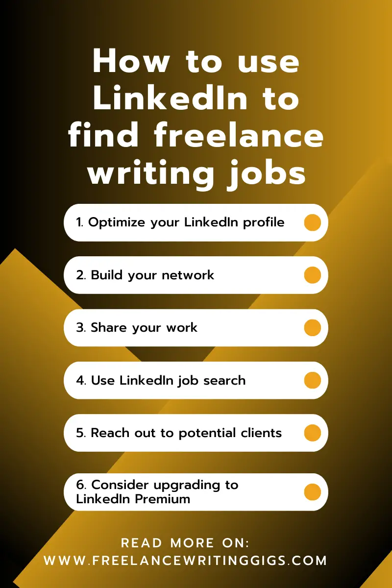 - Use LinkedIn job search: LinkedIn has a job search feature that allows you to filter job postings based on location, industry, and job type. Use this feature to find freelance job opportunities that match your skills and interests.