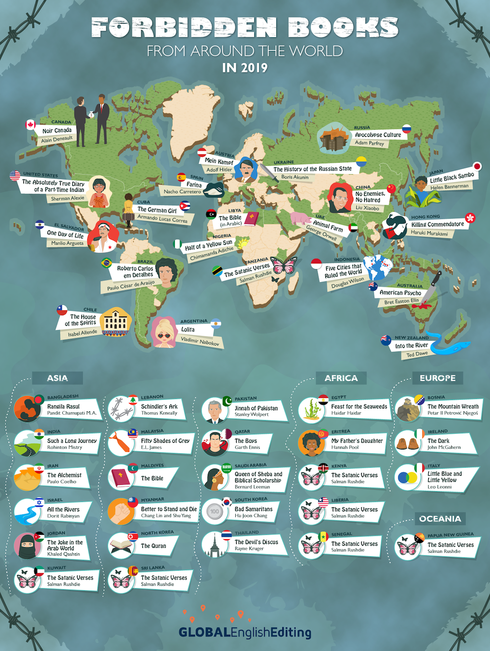 To help kick off this year’s Banned Books Week beginning next Monday, Global English Editing have created this gorgeous map highlighting nearly 50 books still banned in countries around the world.