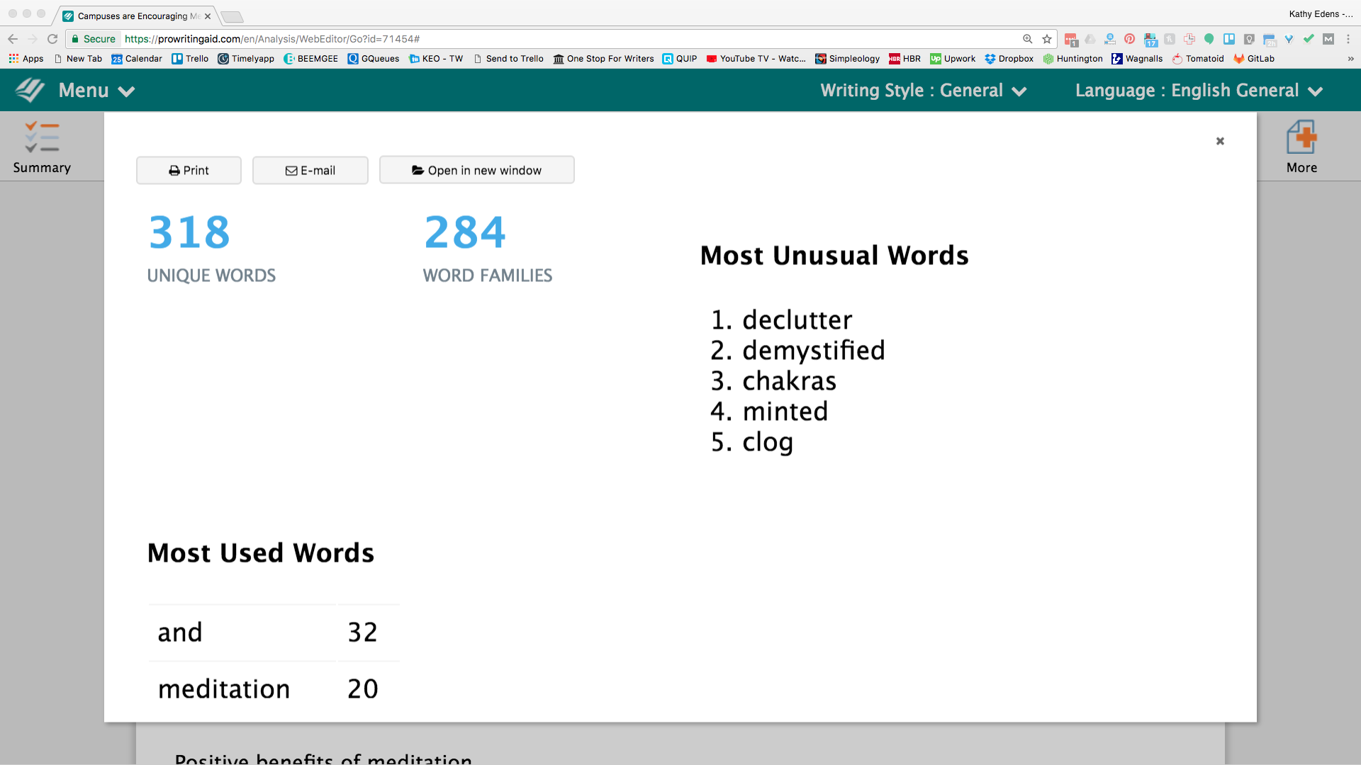 The total word count for the post was 619 words, of which 318 were unique. But look at the most-used words. “Meditation” occurs 20 times in a 600-word post! Even if it’s a keyword for SEO, that’s overkill.