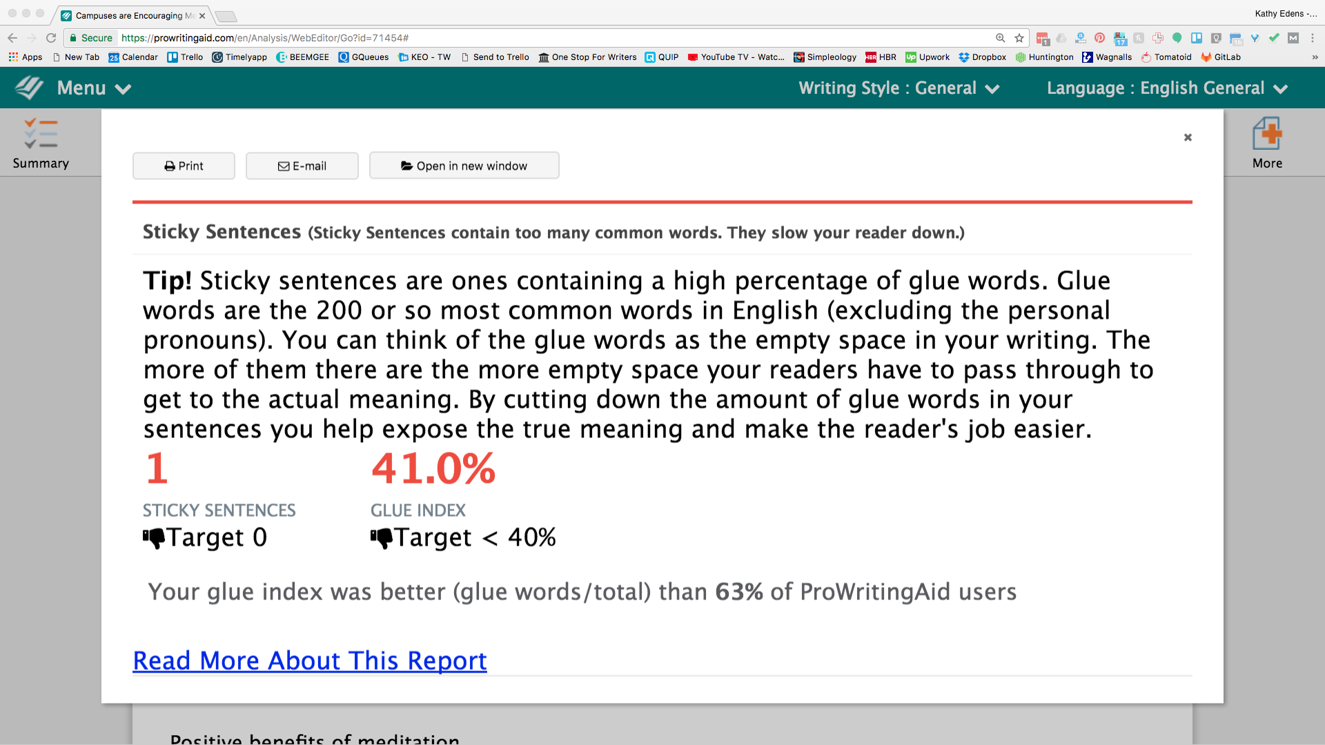 The next part of the Summary Report shows your content’s glue index. The glue index is the number of sticky sentences in your content.