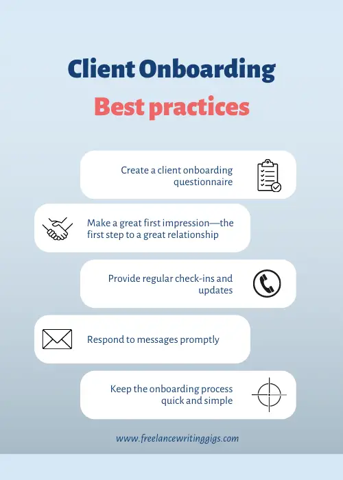 The onboarding process might seem simple to you but unfamiliar clients will need assistance at points. Try to keep yourself available in this process and respond to any messages from your client. Responding promptly will also help to build that crucial first impression.