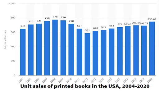 Unit sales of printed books in the USA, 2004 – 2020 graph: Image Source