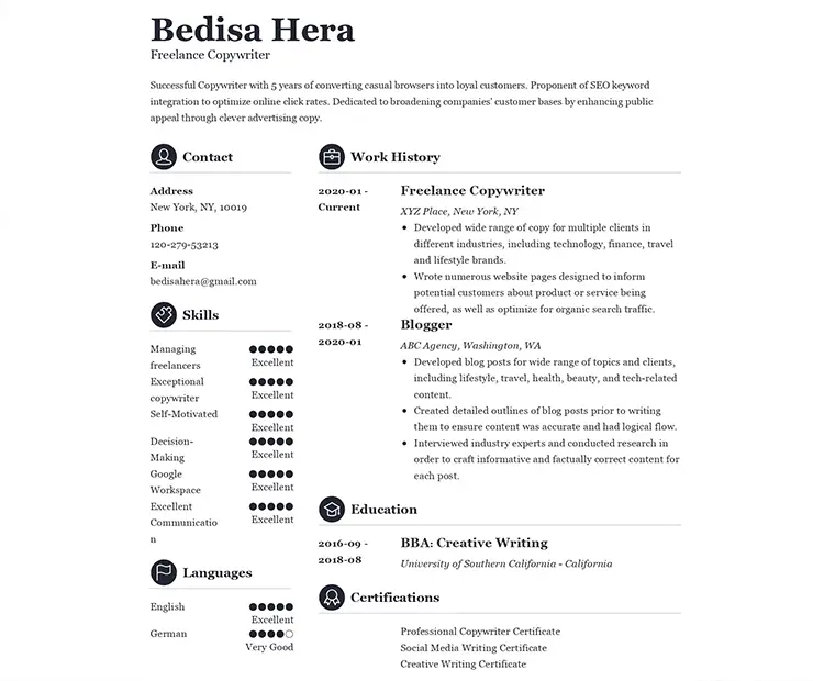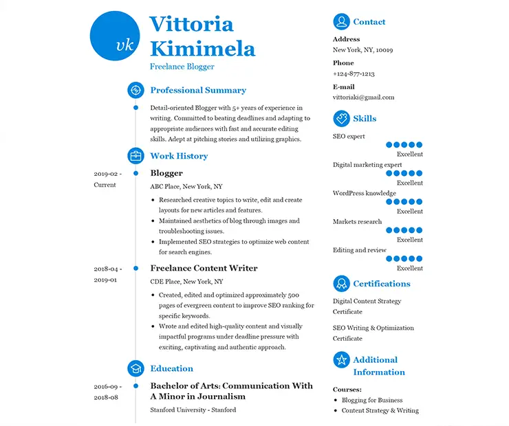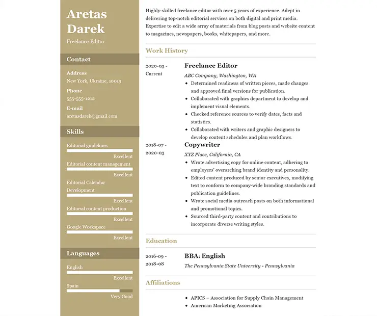 While a traditional resume might list your education chronologically, a freelance writer’s resume should highlight the programs and courses relevant to your field. If you have a degree in English literature, highlight any writing-intensive practices, internships, and independent projects involving complex writing. You can also mention any awards or fellowships if you’re a recent graduate.