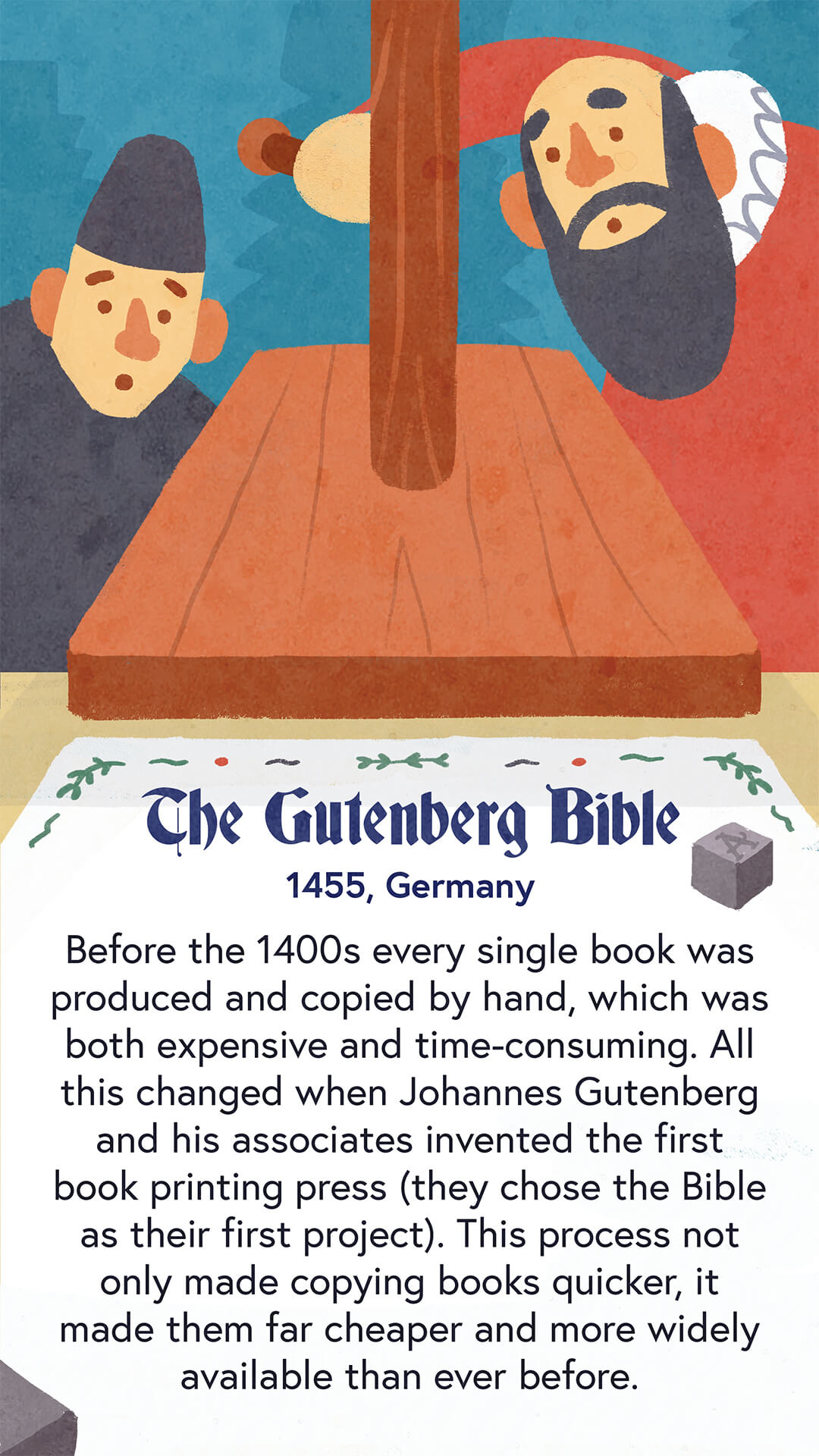Pre-fifteen century every single book was handwritten. This made books inordinately expensive and ensured there weren’t many books available in the first place. Johann Gutenburg and his associates invented the first-ever book-printing process in 1455. In their first run, they printed the bible and were essential in making reading a more accessible activity.