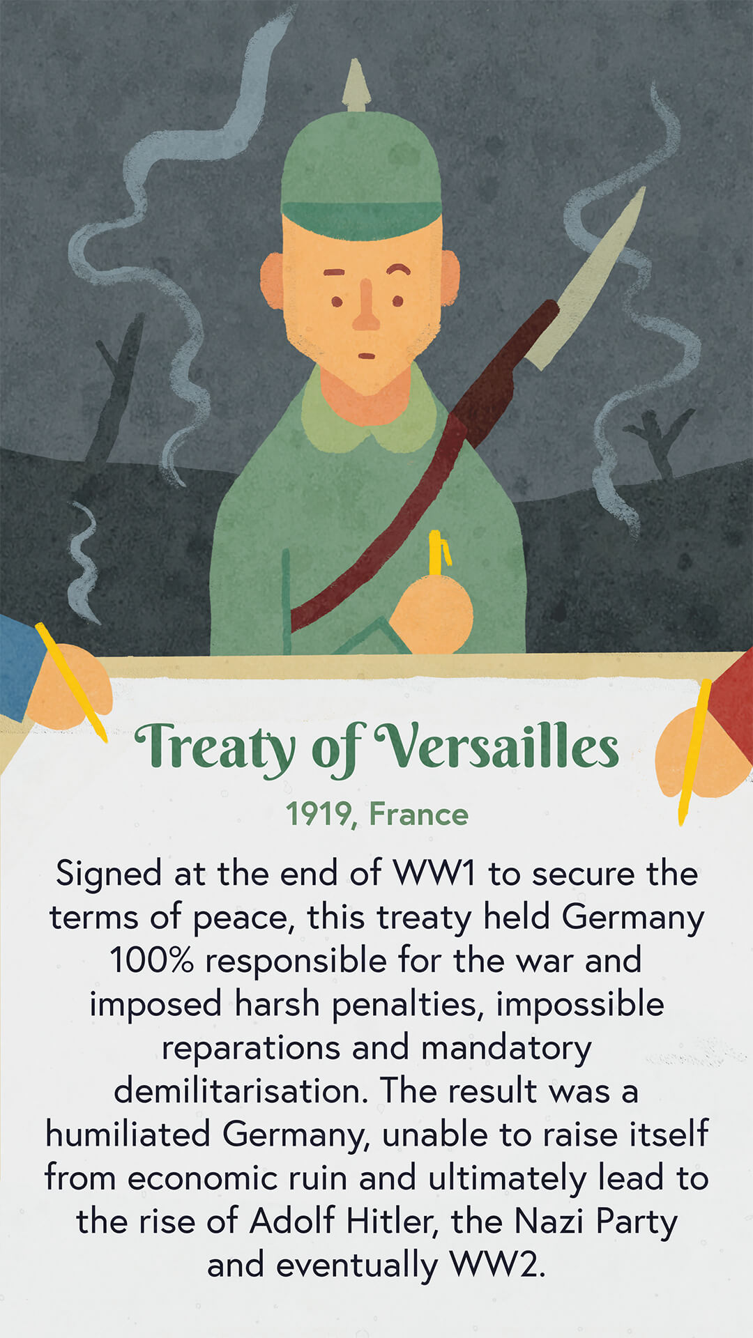 Seen by many as a defining moment in modern history, this document was intended to codify the terms of peace post WW1 between The Allies & Germany. The Treaty imposed harsh penalties and reparations Germany was unable to repay, this pushed Germany into a state of poverty and humiliation which set the stage for the rise of the Nazi Party.