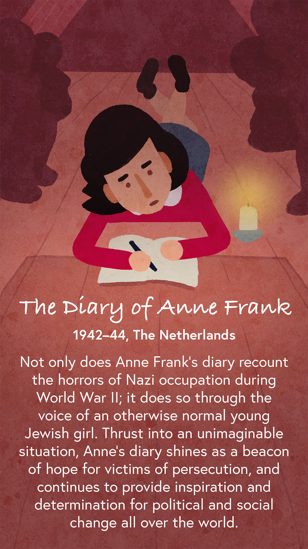 Written between the ages of 13 and 15, Anne Frank’s diary documents her life in the Nazi-occupied Netherlands. Not only did this diary describe the fear of life living hidden in an attic, but it also described her life before including her friends, families, and interests. This contrast highlighted the horror of the war and has been used as a symbol of persecution and inspiration since its publication.