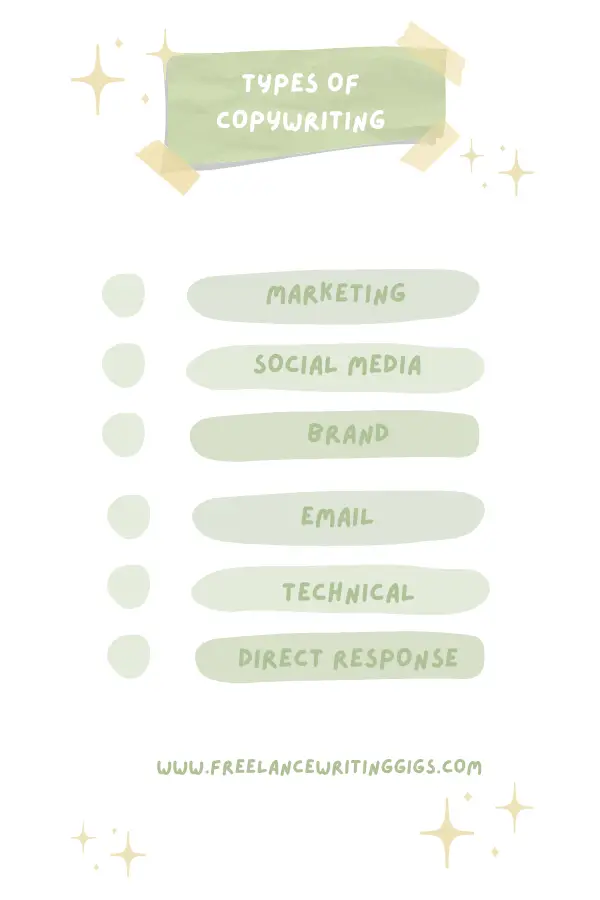 Brand copywriting entails both public relations and marketing to create the image of a brand through messages. Direct response copywriting works as its name suggests a form of messaging that incites a direct response as a form of compelling people. Technical copywriting focuses on the technical side of marketing by writing brochures, case studies, or websites.
