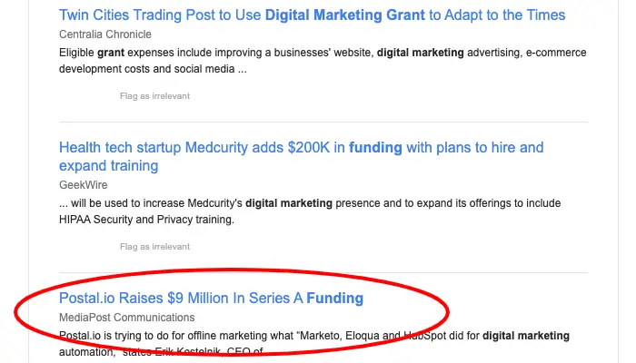 First, set up Google Alert emails with a keyword related to your writing niche + funding. For example, since I write for marketing SaaS companies, I have “marketing automation funding” set up as a Google Alert.