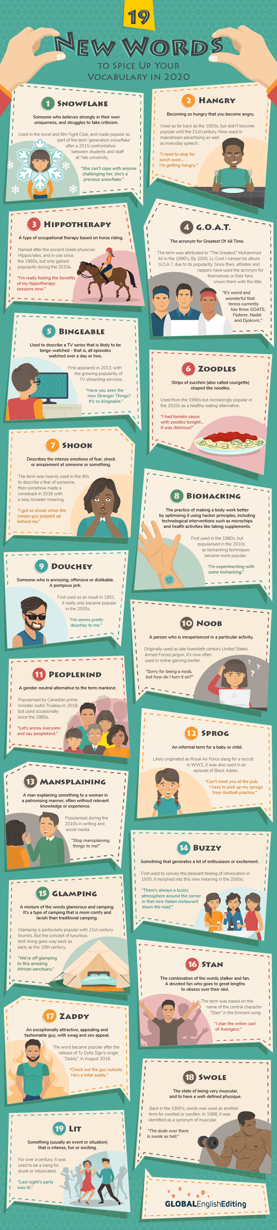 Global English Editing’s infographic below lists 19 new words for you to use in your writing in 2020. They provide a definition of the word and an example of it being used in a sentence.