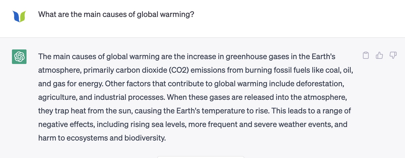 Say you’re writing a piece about global warming. To get started, you can ask ChatGPT, “What are the main causes of global warming?”